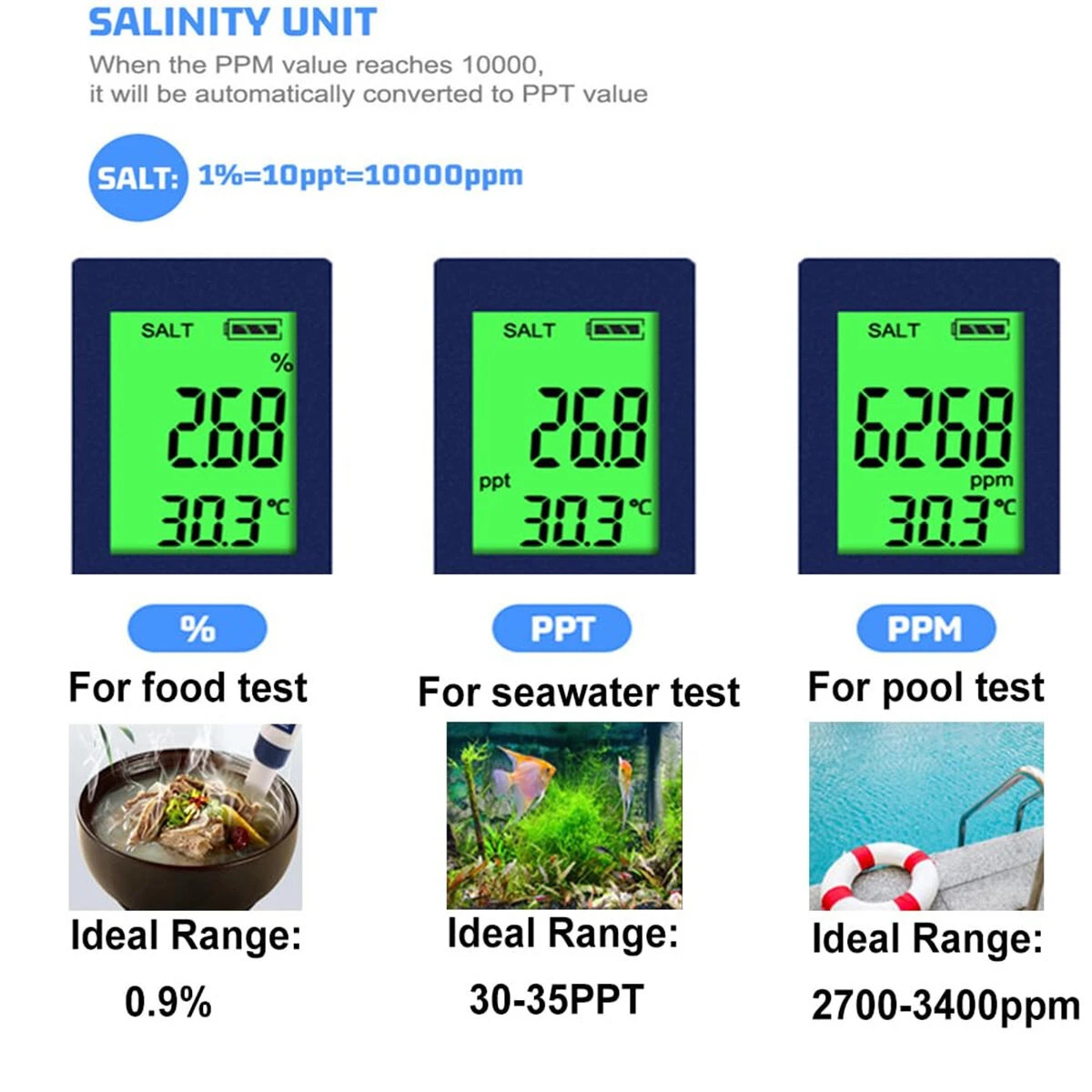 Salinity Testing Range: Swimming Pool: 0-9999ppm; Seawater: 10-200ppt; Food: 0.01-25%.
