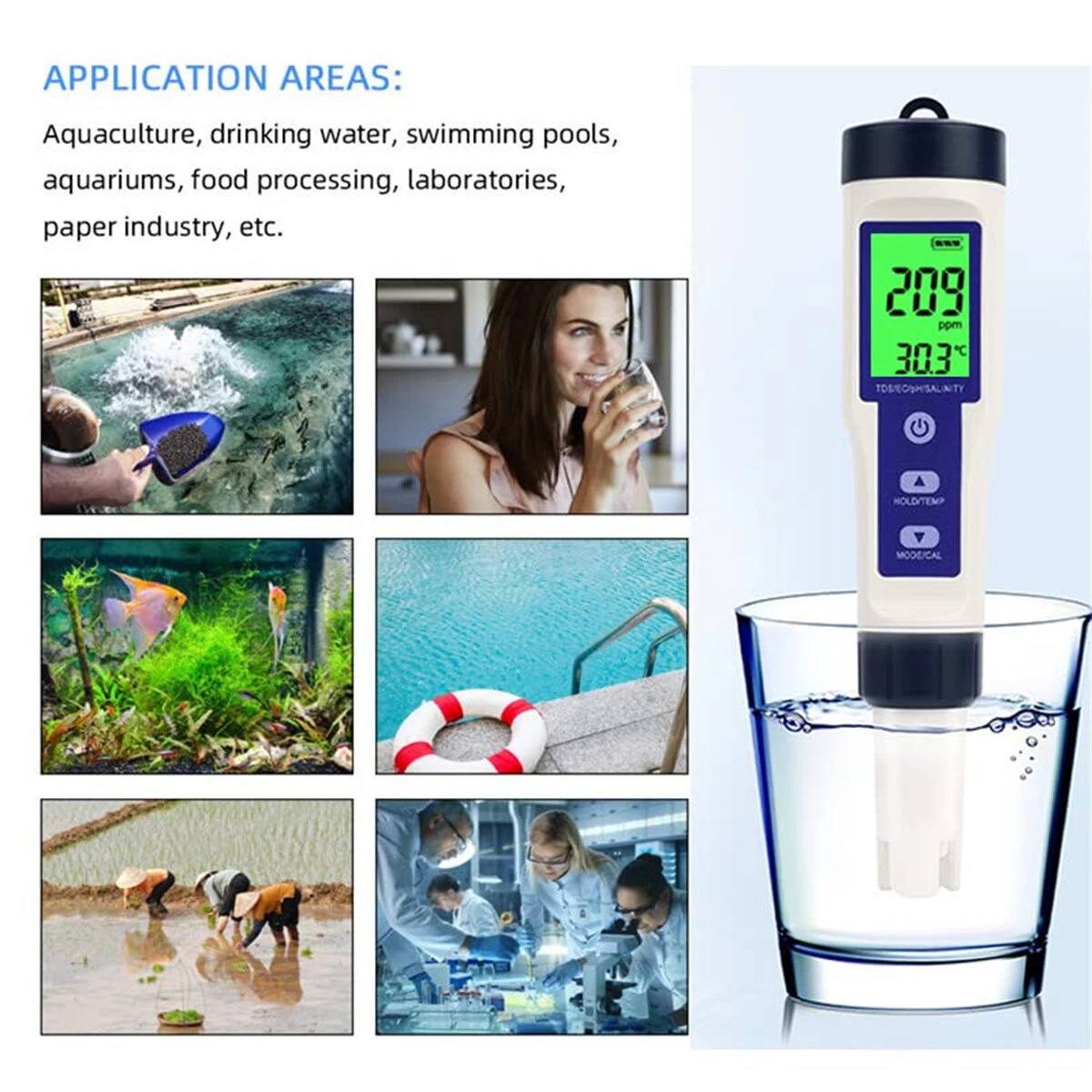 Multifunctional Salinity Tester: The Digital Salinity Meter is a comprehensive 5 in 1 water testing solution. This high-accuracy tool, perfect for saltwater environments, offers Salinity, TDS, EC, pH, and Temperature measurements all in one device.