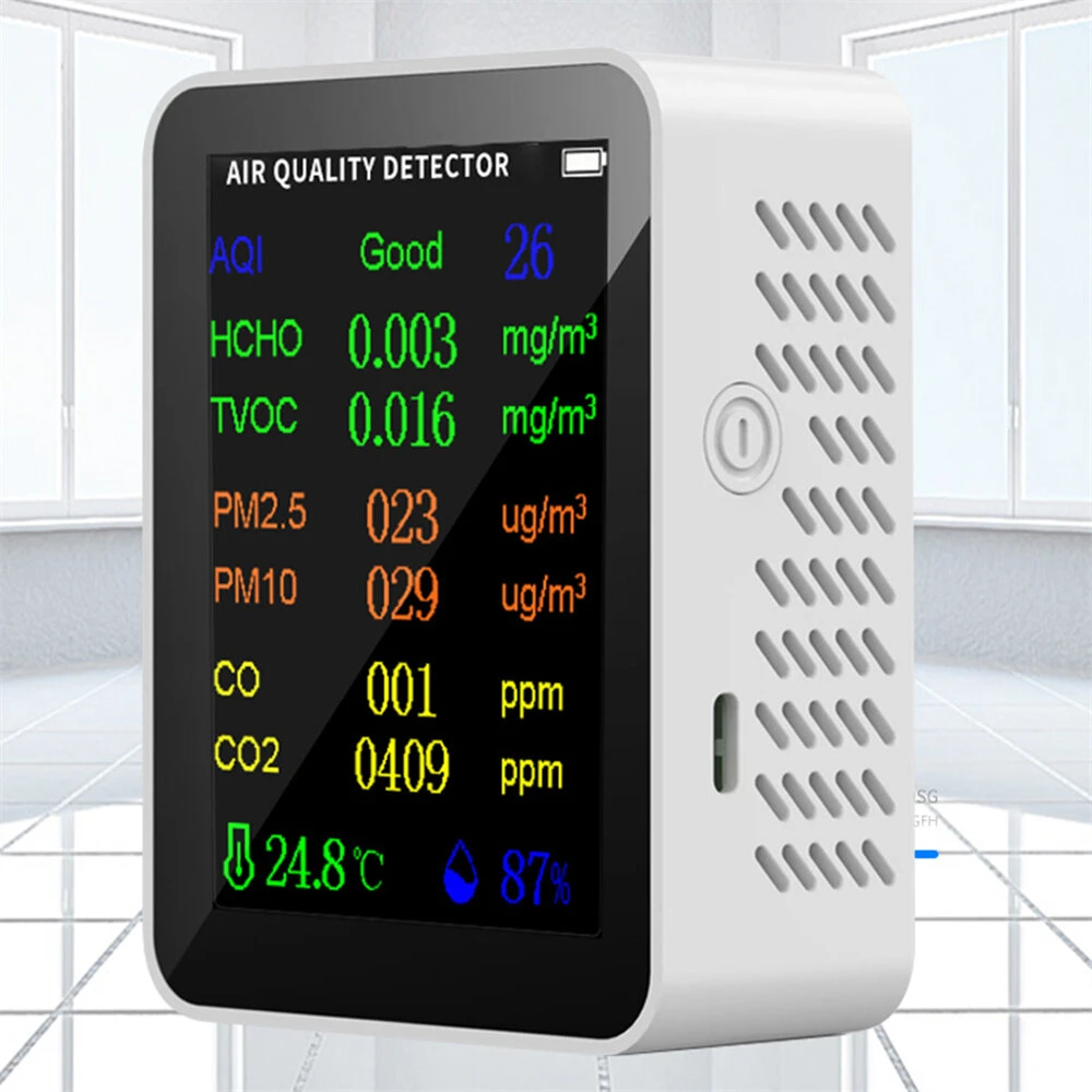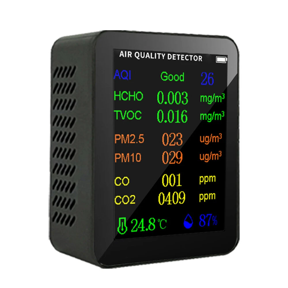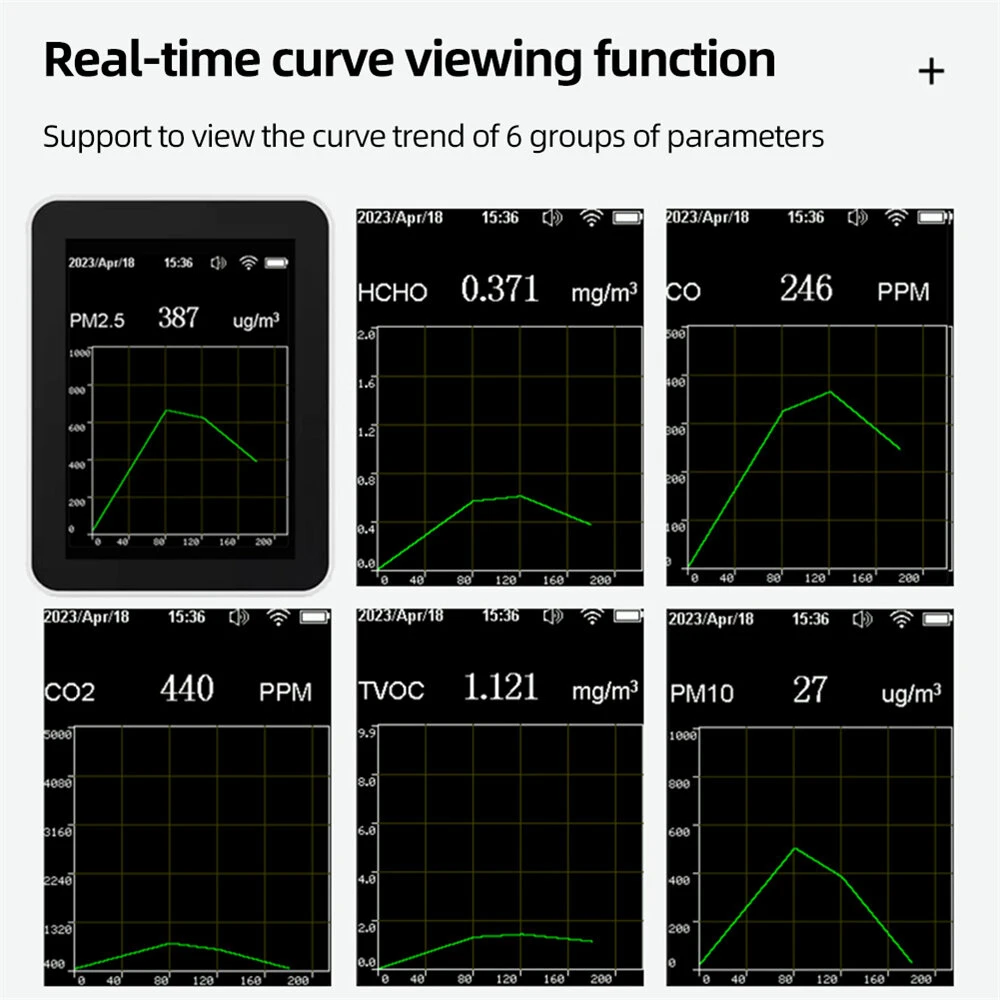 Comprehensive : The 9-in-1 Air Quality Monitor is designed to accurately detect PM2.5, PM10, HCHO, TVOC, CO, CO2, as well as temperature and humidity, providing a detailed into the quality of your environment.