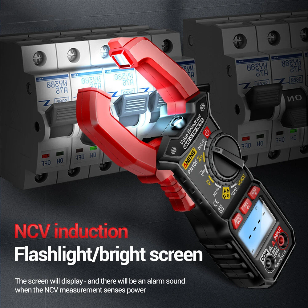 2. When the NCV senses the power supply, the screen will display — and there will be an alarm sound, flashlight and backlight bright screen to help the measurement in dark environment