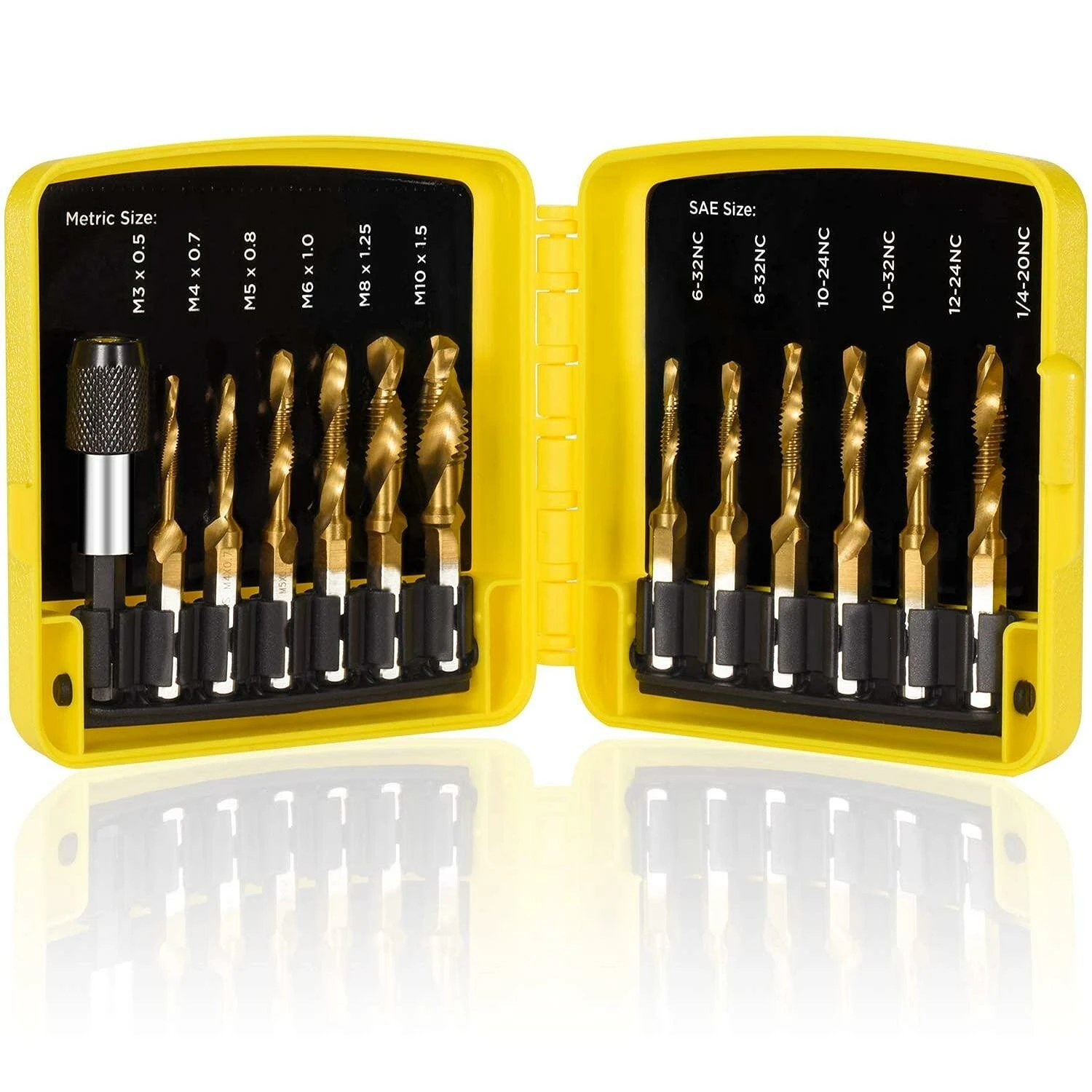 【Various sizes】Can be used to tap various threads. 6PC SAE: 6-32NC, 8-32NC, 10-24NC, 10-32NC, 12-24NC, ¼-20NC; 6 metric-M3 x 0.5, M4 x 0.7, M5 x 0.8, M6 x 1.0, M8 x 1.25, M10 x 1.5; 1 piece-quick change adapter.
