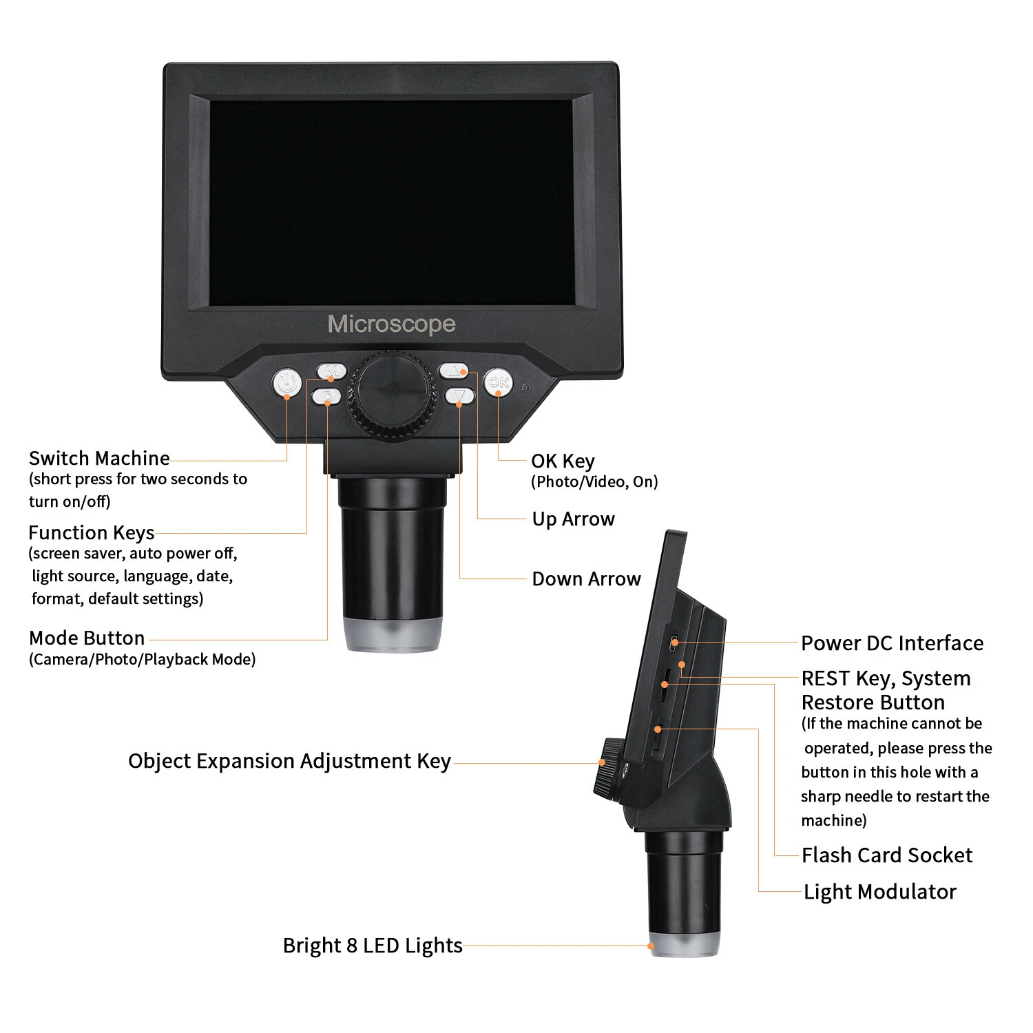 1:Focusing wheel, adjust the sharpness of the image by rotating left and right.
