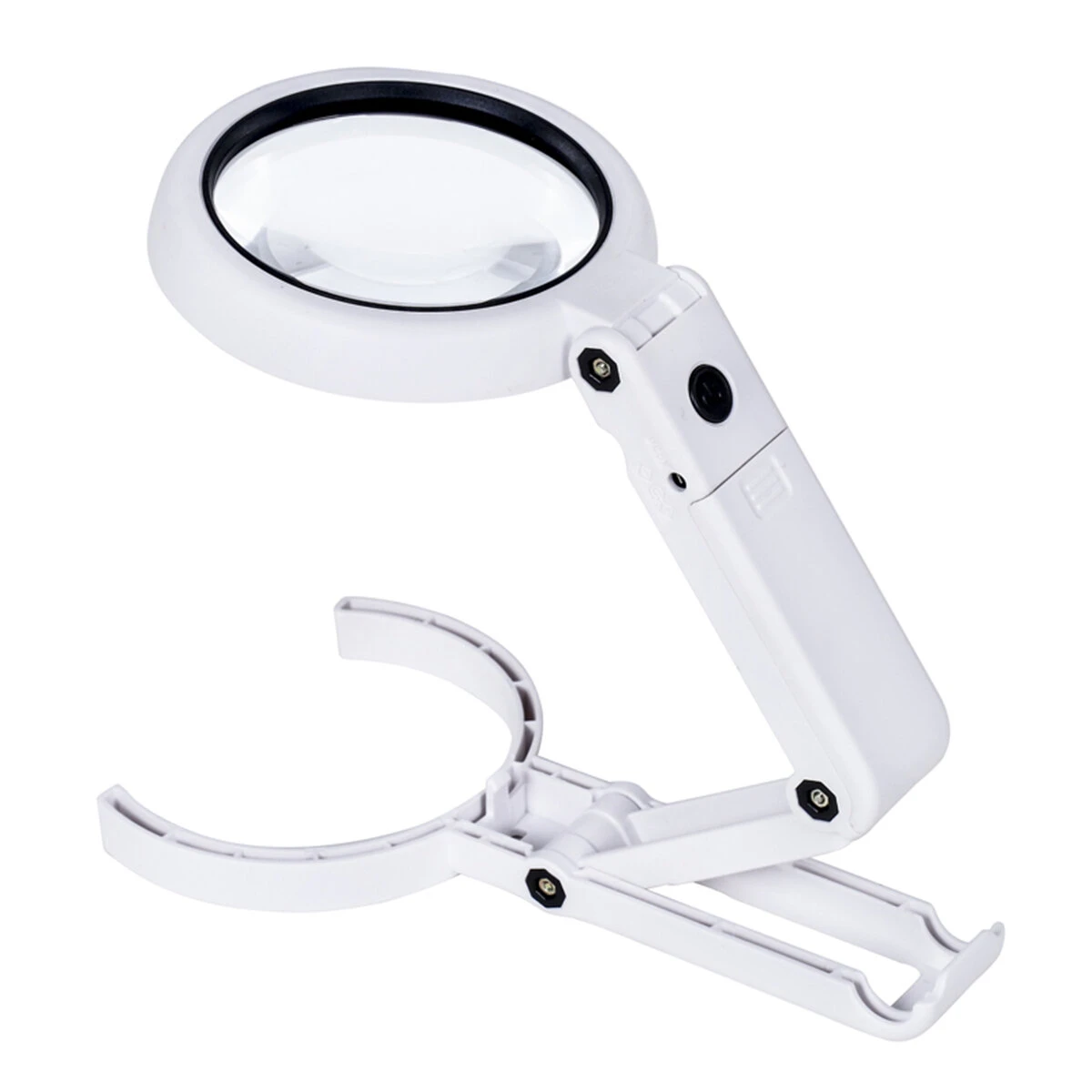 – Folded handheld and unfolded hand-free 2-in-1 magnifier with 75mm lens for 5X & 19mm lens for 11X magnification.