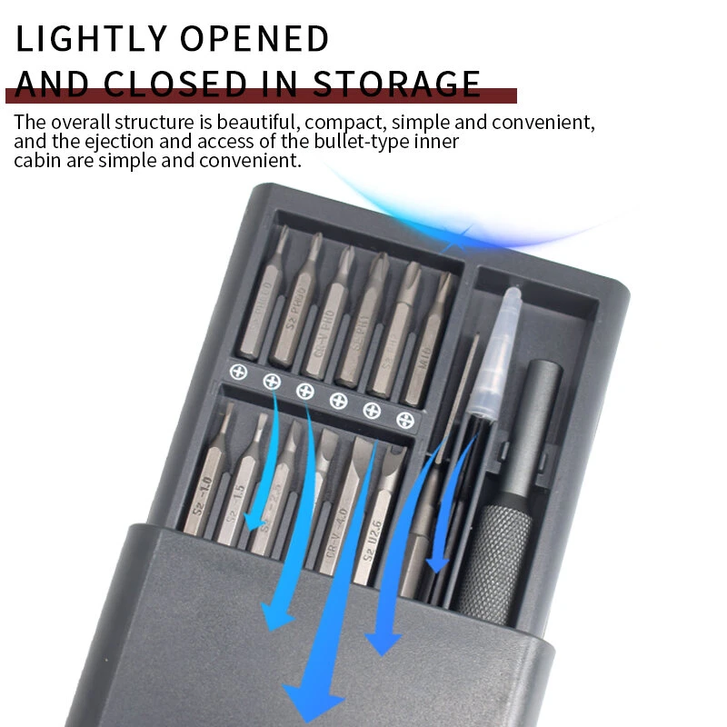 Simple Design The screwdriver set box has, a perfect compact design, a magnetic bit position, and a portable size.Just squeeze lightly and it will come out.
