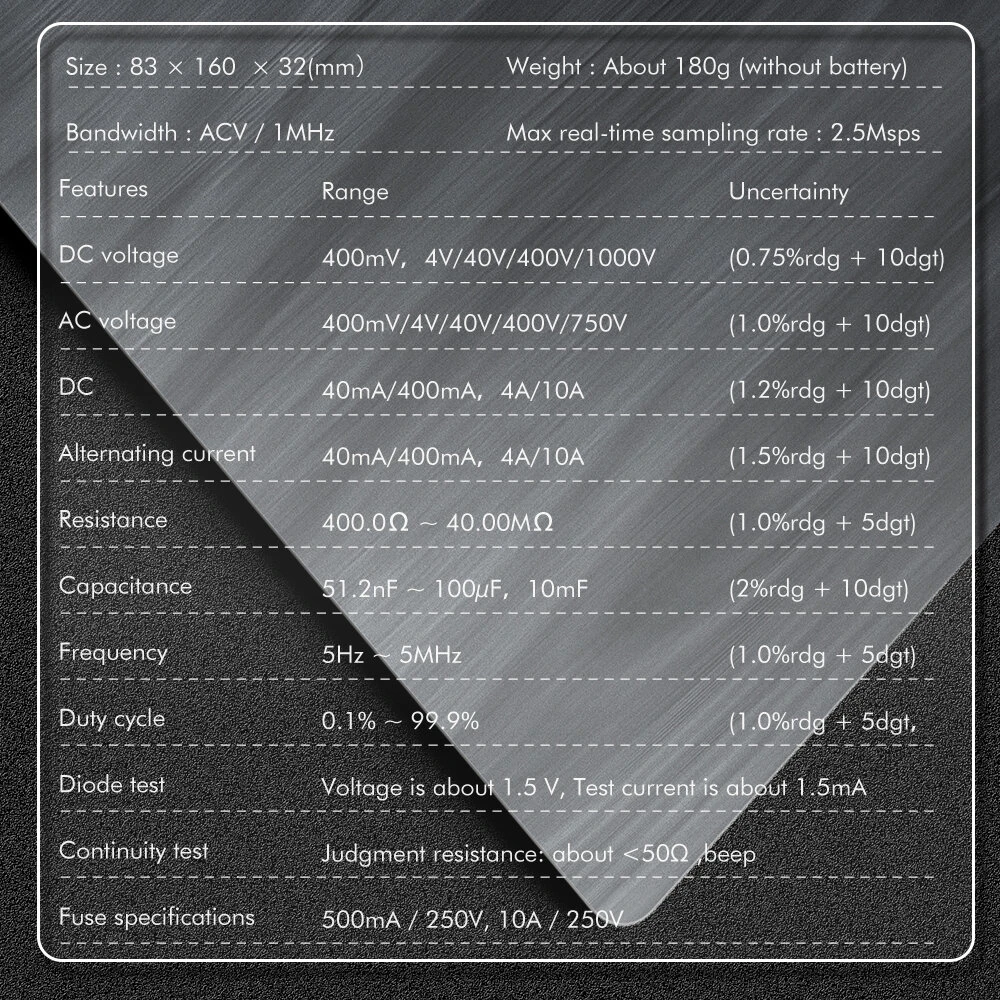| AC voltage | 400mV/4V/40V/400V/750V | (1.0%rdg + 10dgt) |
