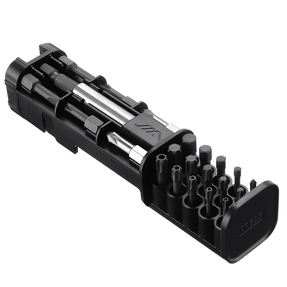 Small size, easy to store and carry. Aluminum shell, High-precision integrated molding process, rounded arc edges for comfortable grip. Press magazine design, press to open and close. 23 in 1 compact and cool toolkit. The inner liner fixes the bit, extension rod and the cutter rod together. High strength magnetic fixed head. Don’t worry about the bits scattered around. 21 high-precision bits, 9 types in total. Suitable for furniture, small appliances, etc., Meeting most daily repair needs.Sandblasted anodized surface, anti-sweat and anti-corrosion. Screwdriver,Small and sophisticated, comfortable and effortless,suitable for various environments. The arbor adopts magnetic adsorption design, holding the bit firmly without falling off. Labor-saving structural design, based on ergonomics The thumb, index finger and tiger’s mouth form a stressed surface. Magnetic attraction design in the rod Made of S2 and stainless steel, stable and durable. Easy disassembly, it can be widely used in most household DIY bycicle repairing. |