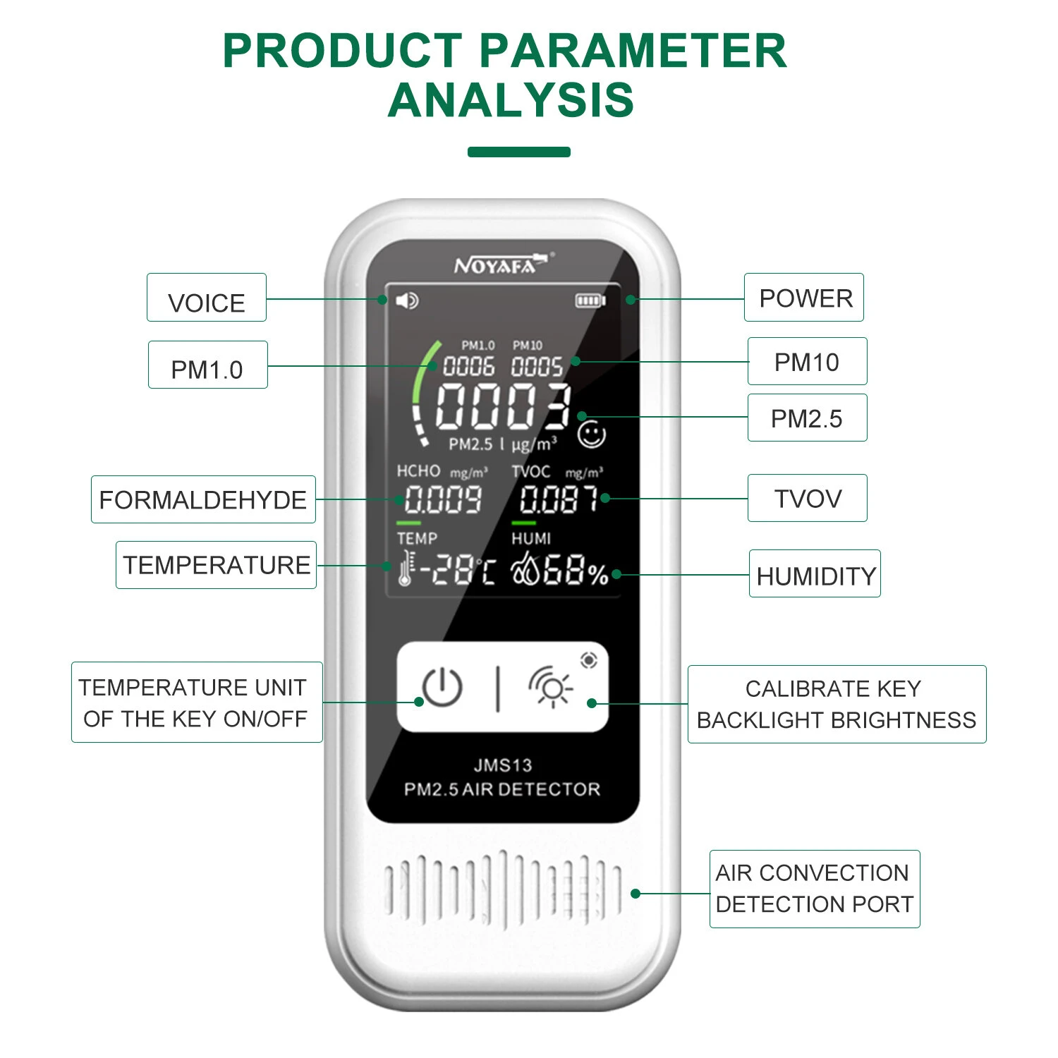 Multifunctional Air Quality discover: it can test the PM2.5, HCHO/TVOC, temperature and humidity, real-time all-round discover , Discover the air quality anytime and anywhere.