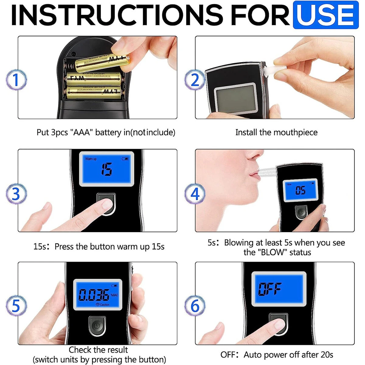 Easy to Operate: Simply warm up the breathalyzer for 15 seconds, blow into the breath inhaler for 3-5 seconds, and receive real-time results on the blue LCD screen within 3 seconds. It is powered by 3 AAA batteries (NOT included) for convenience.