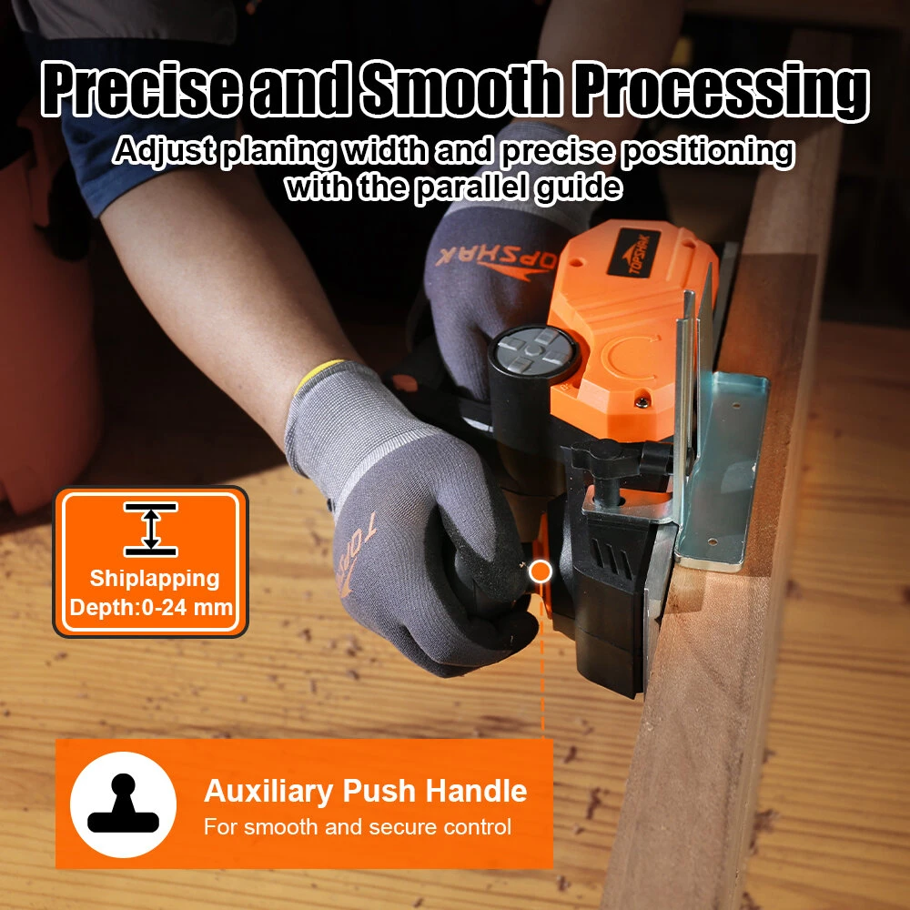 Generates up to 14,500rpm for fast stock removal and smooth finishes. ● Precise and Smooth Processing Adjust planing width and precise positioning with the parallel guide. ● Dual Side Dust Outlet Ejects shavings on left or right side to accommodate your preference. ● Keep Clean and Sawdust Free Connecting Dust Bag and connecting vacuum cleaner. ● All-Mirror Aluminum Bottom Enhance flatness of your workpiece. ● 3 V-shaped Grooves Design angled chamfer along the edges of wood in different sizes. ● Spring Bracket for Protection Elevate planer and protect blade and tool resting spot. ● Left and Right Lock-on Button Help operate from either side and avoid accidental starts.