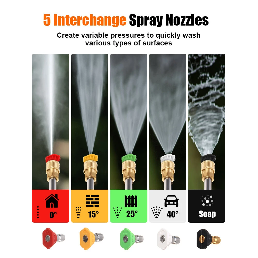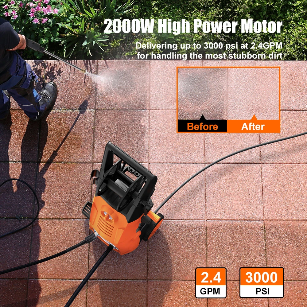 Delivering up to 3000PSI at 2.4GPM for handling the most stubborn dirt ● 5 Interchange Spray Nozzles Create variable pressures to quickly wash various types of surfaces ● Dual Water Intake Way Let your cleaning work not be limited by water sources ● Storage Easier The hose reel keeps a 8m pressure hose organized for quick storage ● Wheels + Handle Provide comfortable transport ● Total Stop System Shuts off automatically when the trigger is not engaged to extend its life ● GFCI Protection Ensure safe use on all exterior outlets
